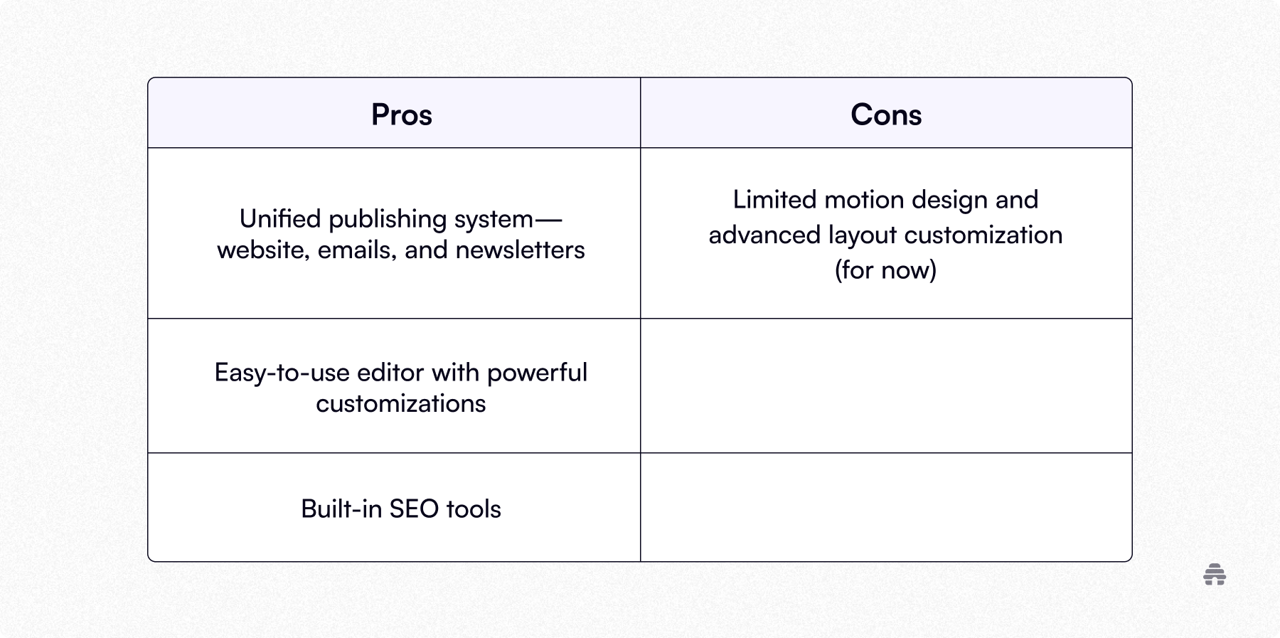 The tradeoff is that it’s not trying to compete with design-heavy tools like Webflow or Framer—and that’s actually a strength. It’s purpose-built for writers, creators, and media businesses who care more about publishing than tweaking pixels.