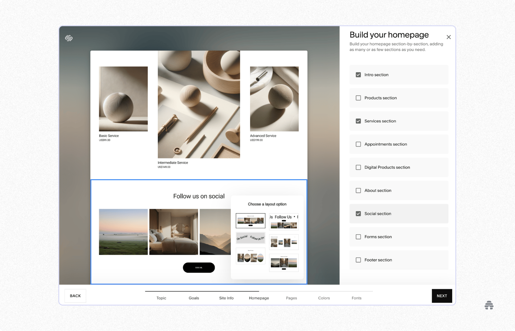 Squarespace’s AI builder stands out because it actually involves you in the design process. Like most AI tools, it starts by asking about your business type and brand style, then generates a personalized intro section.