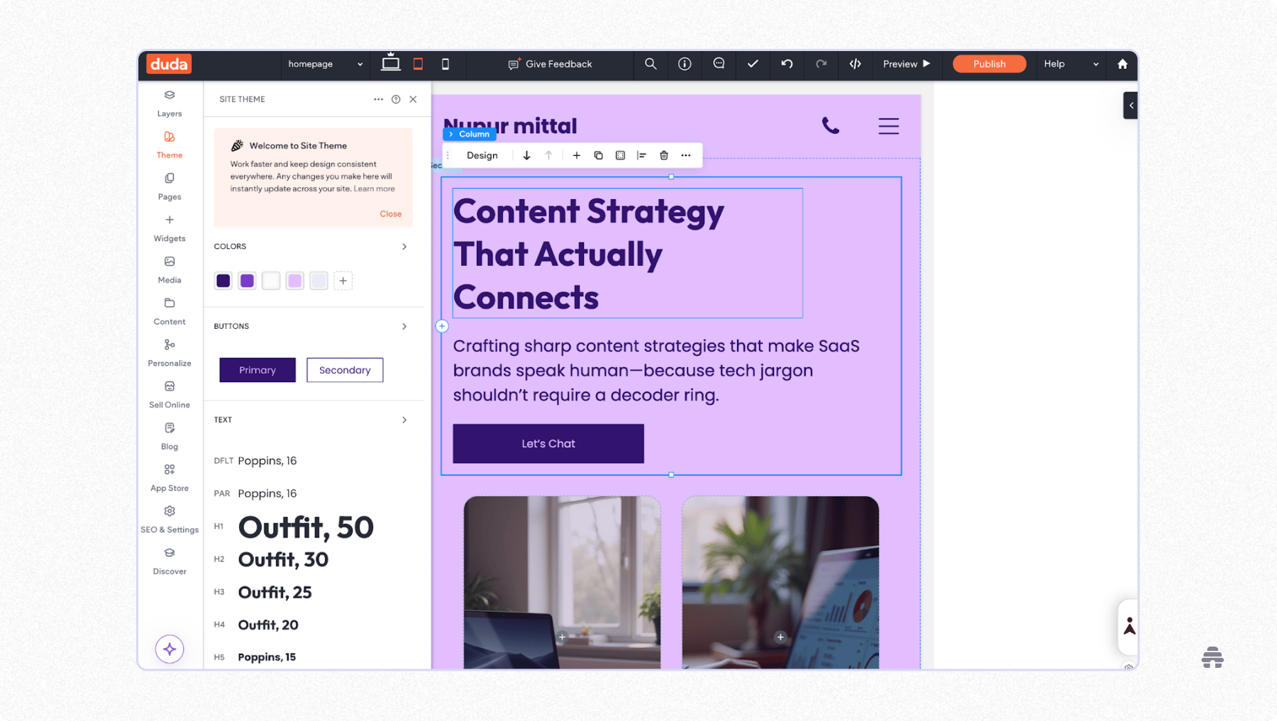 Duda is a drag-and-drop website editor that also offers an AI website builder. It asks you a bunch of info upfront to generate the site, which can be a bit tedious, but essential to generate a close, likeable design. You can edit all the aspects of the website in the editor, which is super handy.