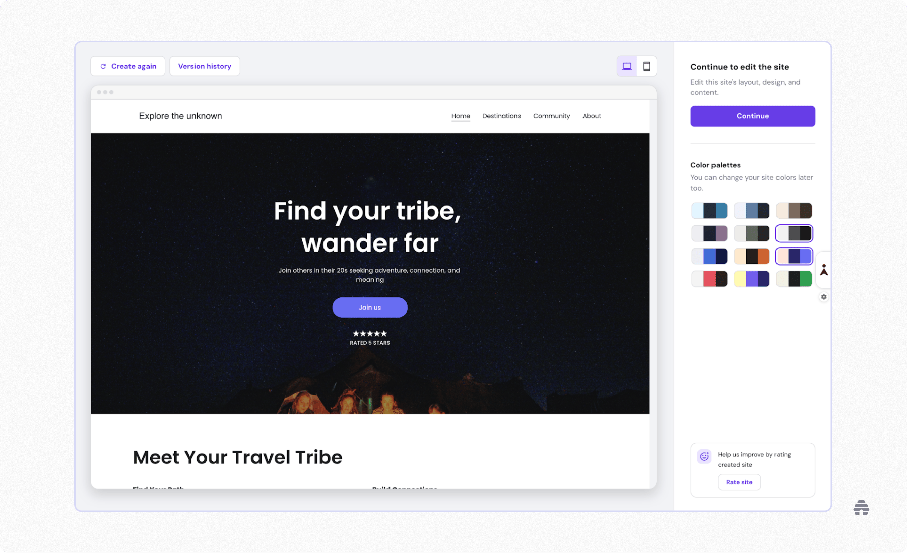 You type what you want (e.g., “Portfolio site for a startup designer”) and it produces something strikingly modern, with smooth transitions and beautiful defaults.