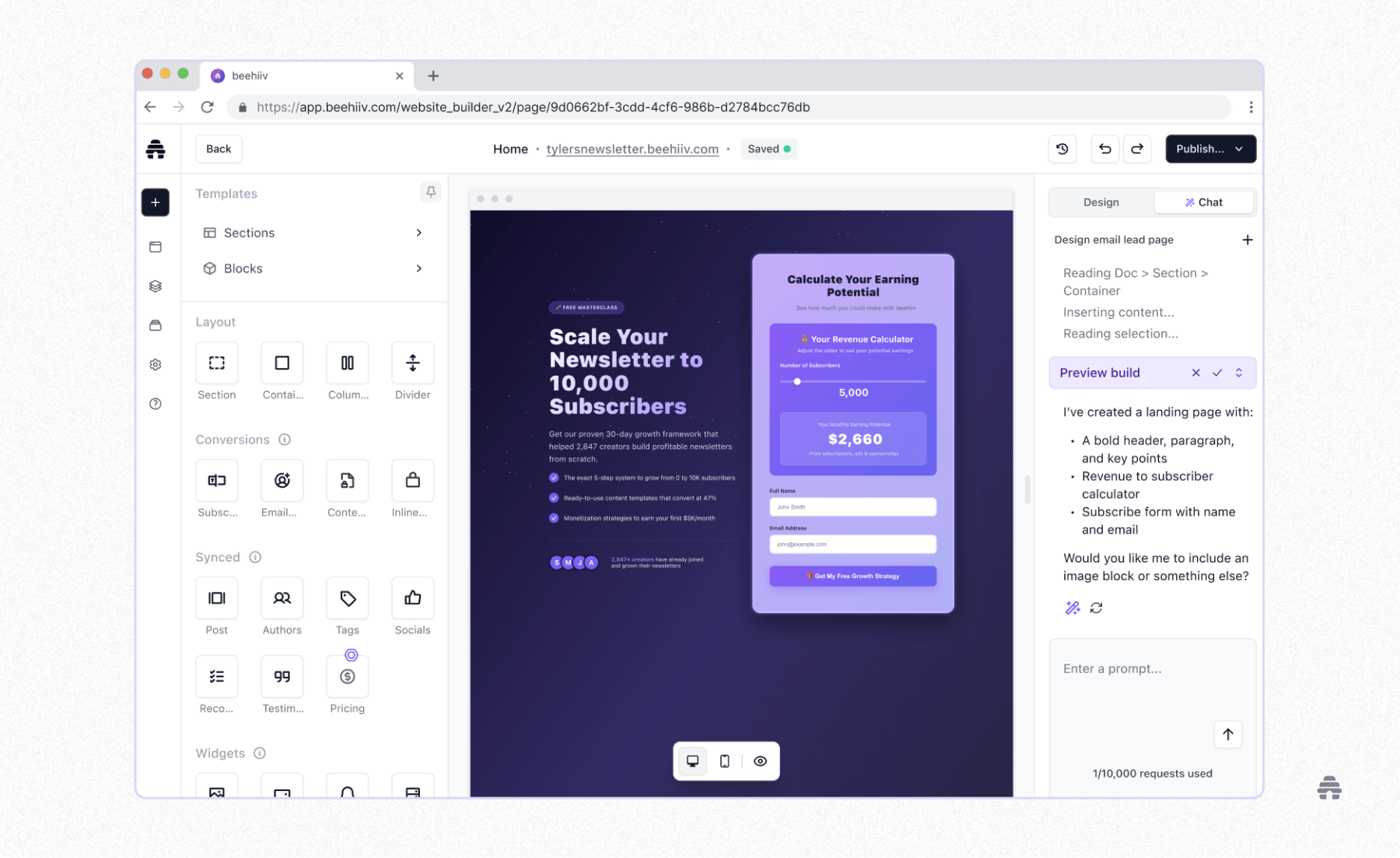 beehiiv’s AI website builder stands out as the best among since it auto-generates layouts that match my brand style and gives me control over the visuals and copy. It’s super easy to use, even if you’ve never designed a site before.