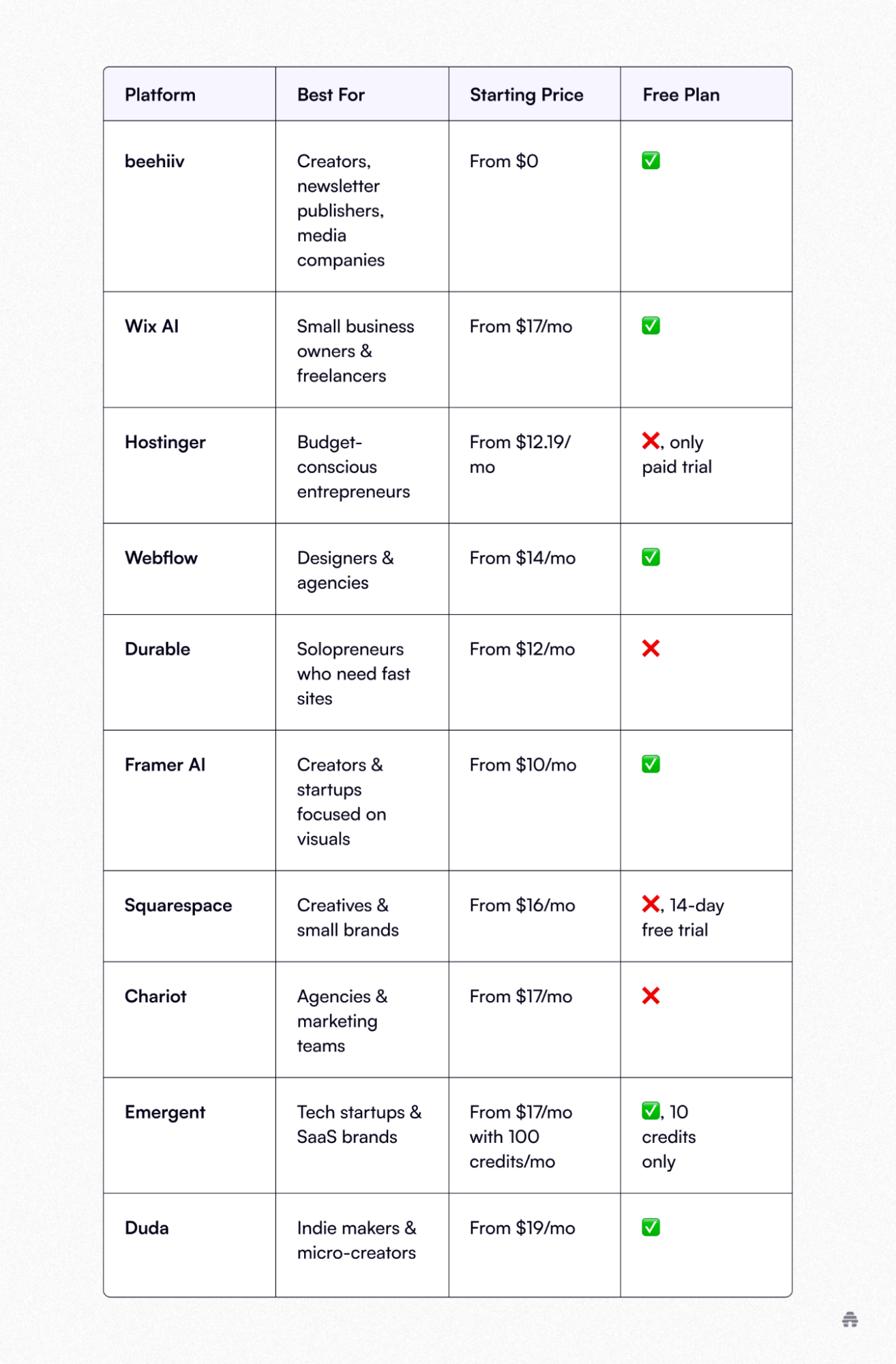 The paid plans for AI website builders start around $12 per month and can go up to $100+ per month, depending on their pricing model (credit-based are most expensive). Some also offer free plans or trials (like beehiiv), but watch for domain restrictions or “AI credit” limits that can add costs later.