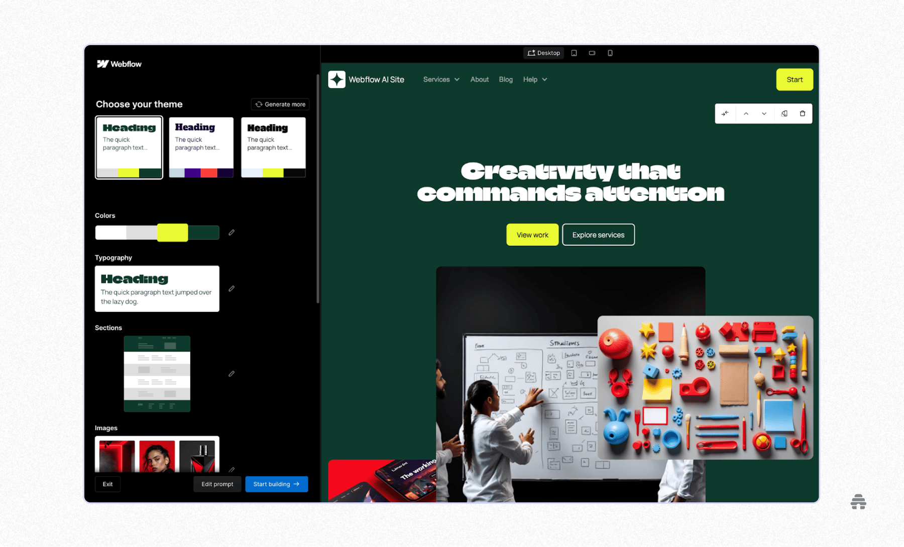 Webflow is the designer’s AI builder. Its AI Site Designer helps generate layouts and sections, but it’s the manual control that sets it apart. You can build pixel-perfect landing pages, connect dynamic CMS collections, and scale complex sites, all without code. But you have to be patient.