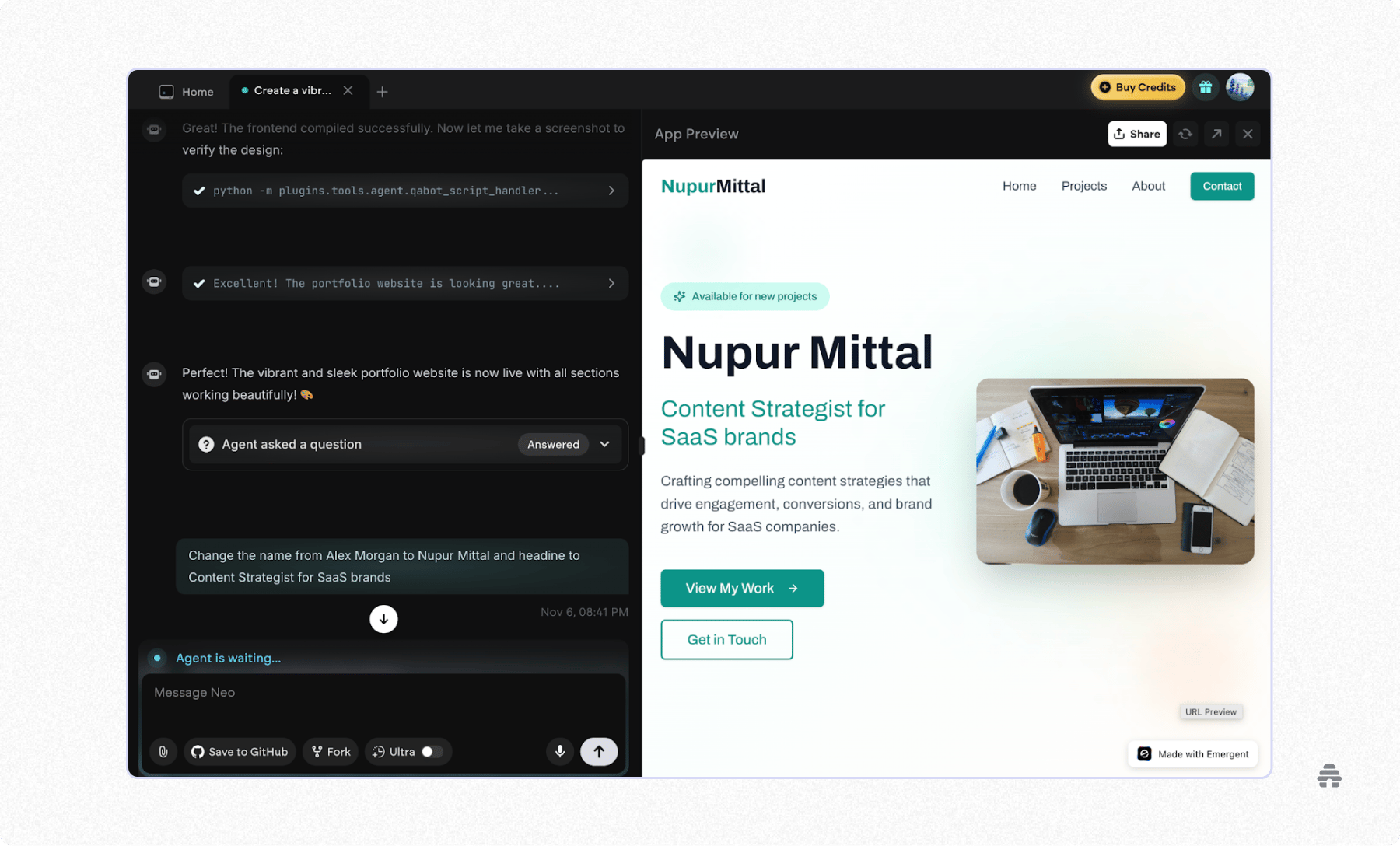 Emergent is a lesser-known but fast AI-based website builder that works in a similar way to Chariot. You share a prompt with the chatbot, and it generates a beautiful first draft. Any change you need? Ask the chatbot to do it.