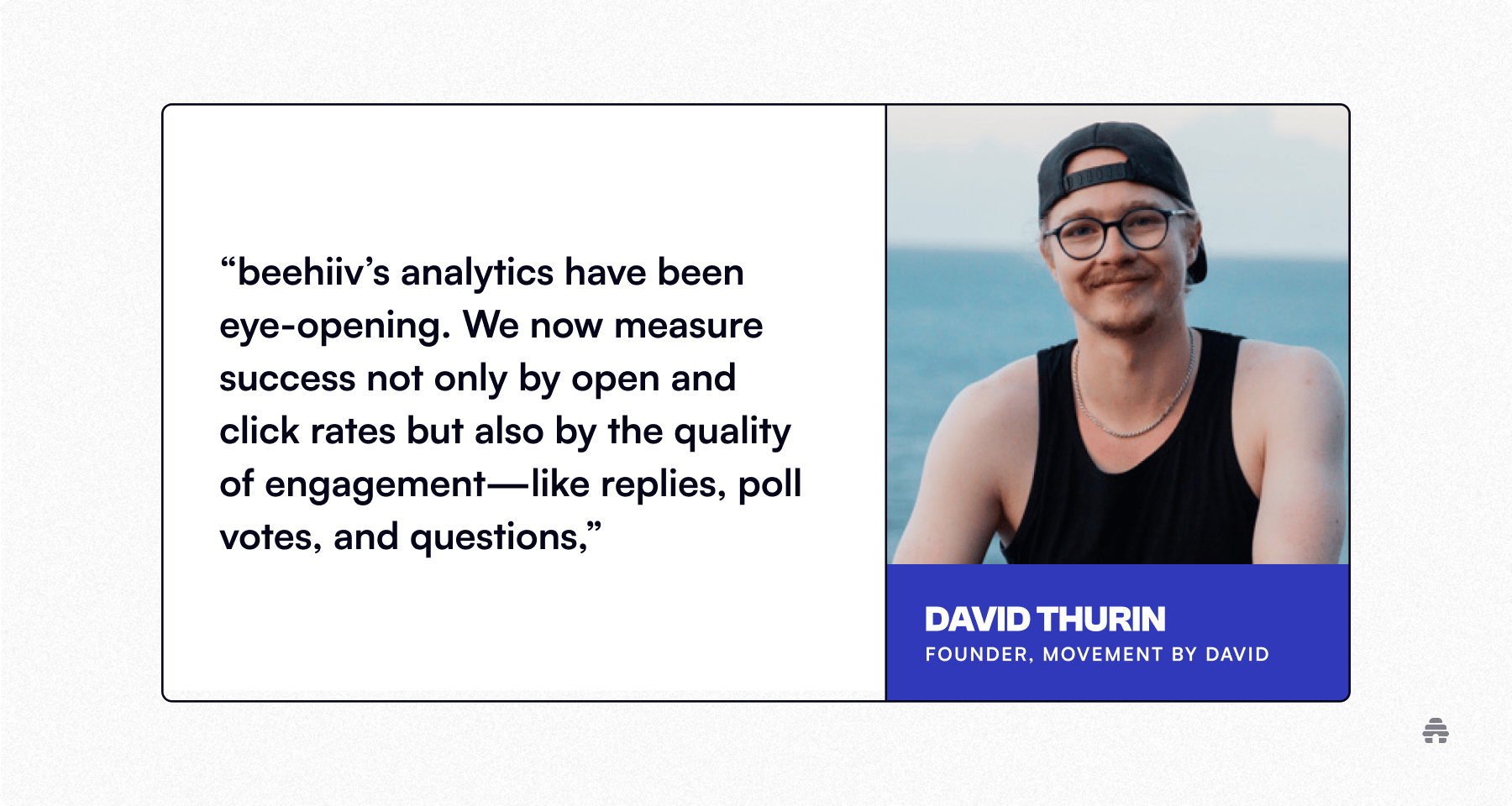 beehiiv offered the infrastructure and creator-focused tools to match his ambition: frictionless signups, built-in earning options, and the analytics needed to refine content week after week.