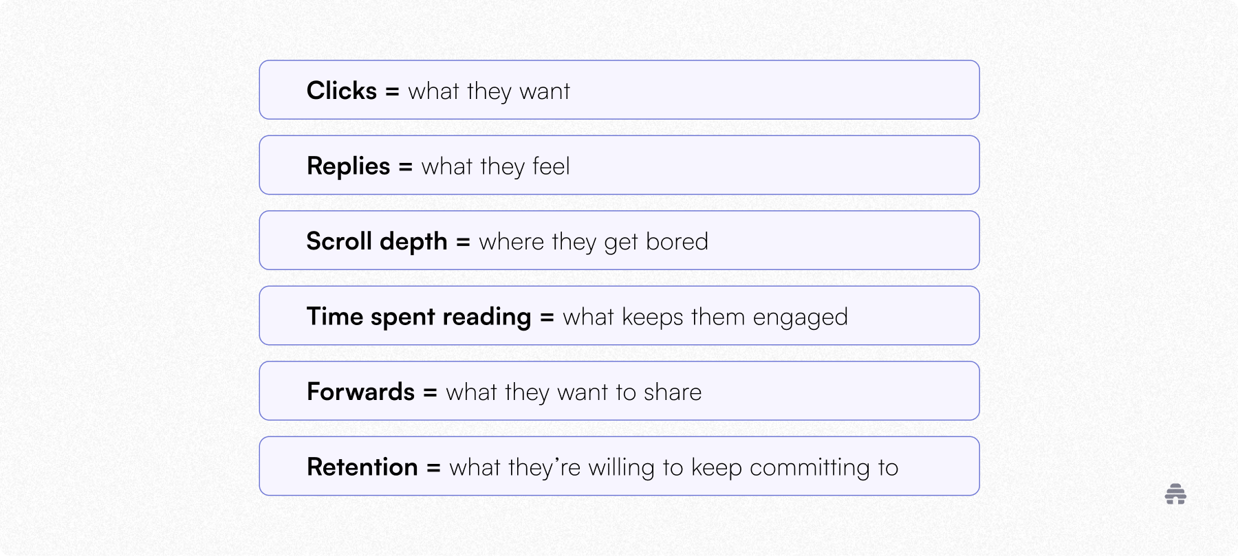 Your Email Engagement Rate (made up of a cluster of metrics like clicks, replies, forwards, and retention) is the only thing that actually tells you whether you’re creating content your readers care about.