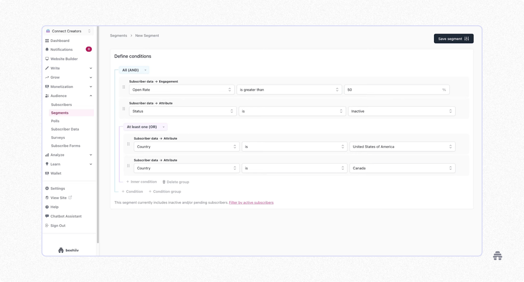 If you want to send targeted emails to different groups of subscribers, beehiiv’s segmentation tools make it easy.
