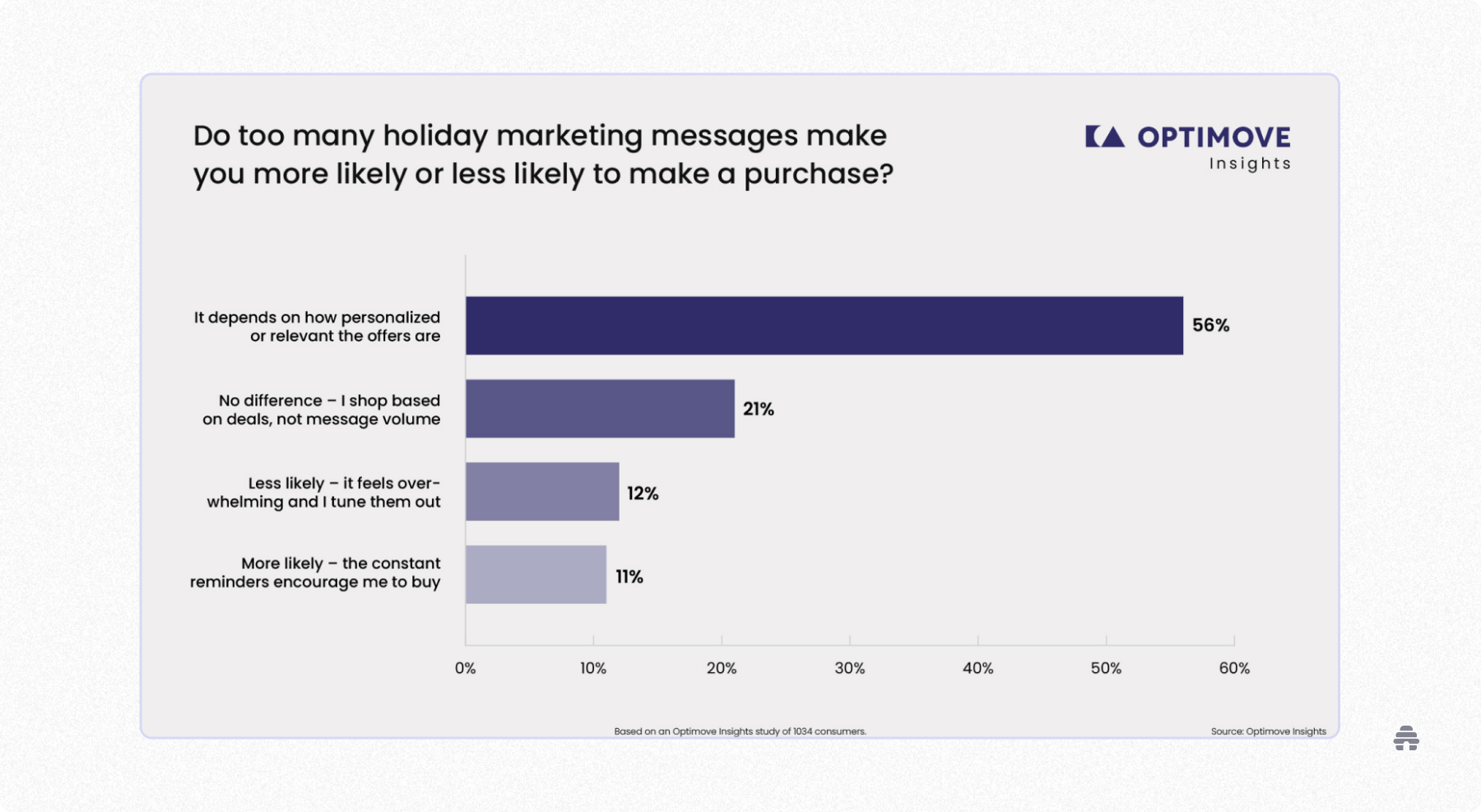 According to Optimove’s 2025 Marketing Fatigue Report, 56% of consumers say BFCM campaigns increase their likelihood to purchase, as long as offers are personalized to their interests.