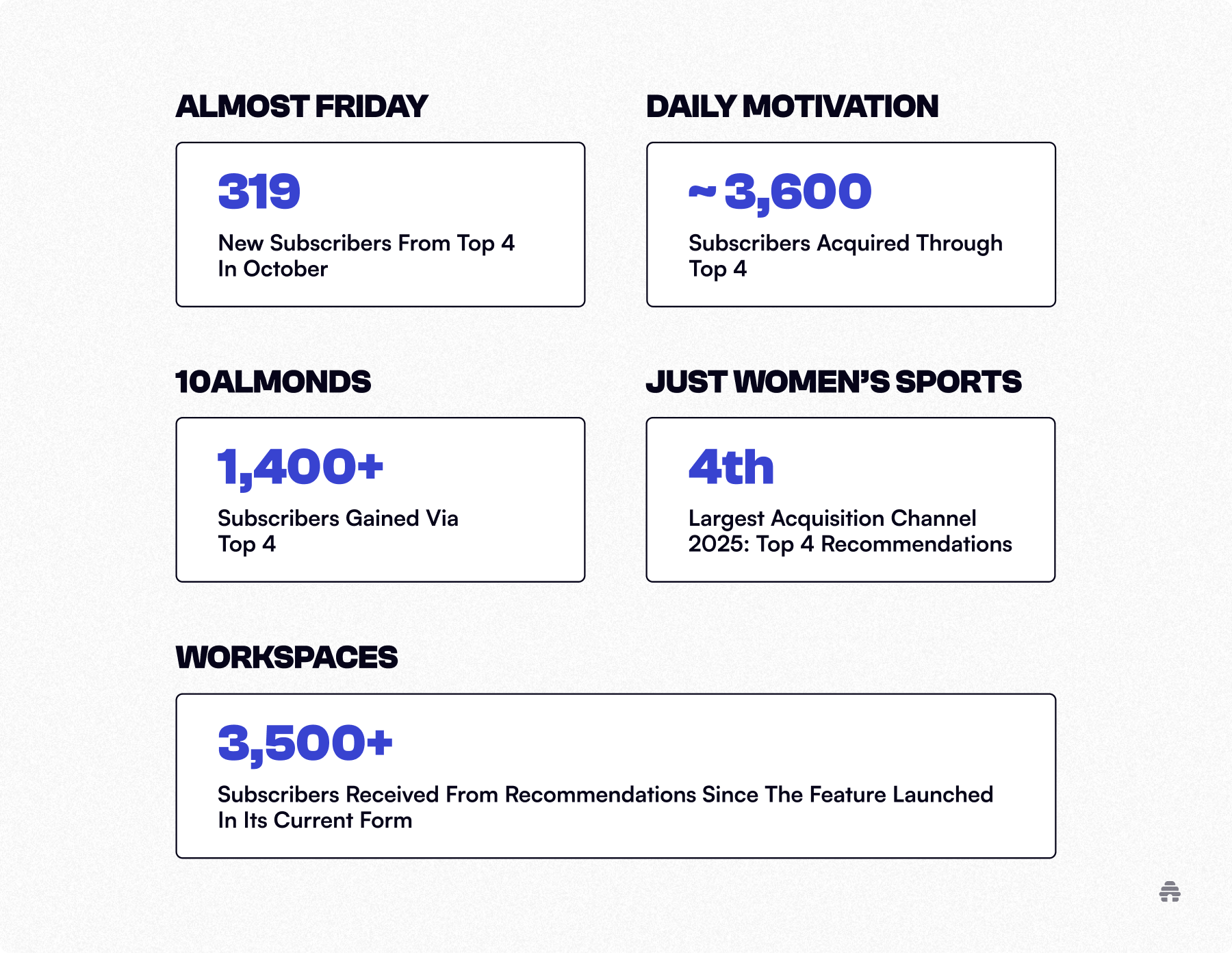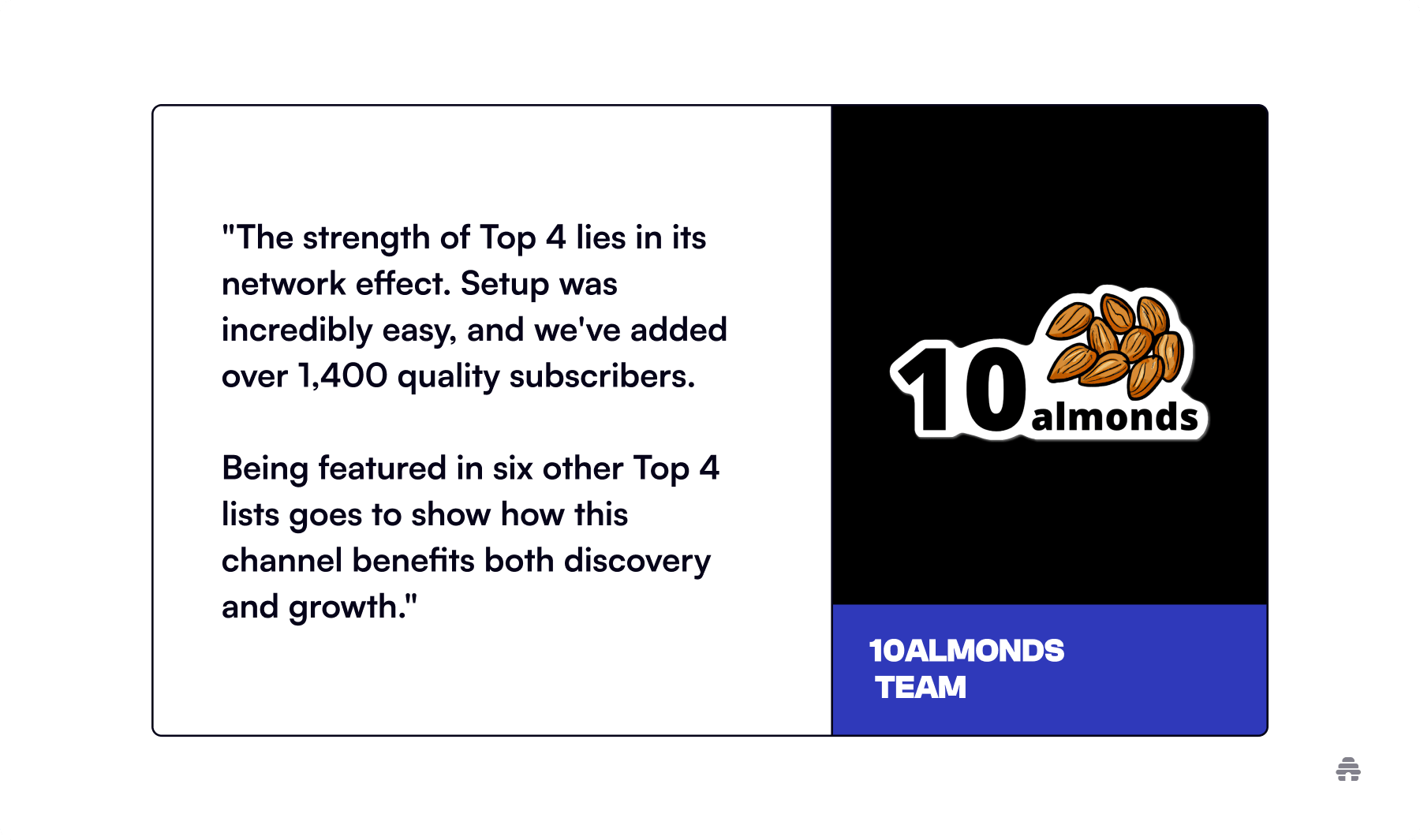 Features in other publishers' Top 4 expose 10almonds to fresh, pertinent audiences. This drives more subscribers, boosts performance, and increases visibility across the network.