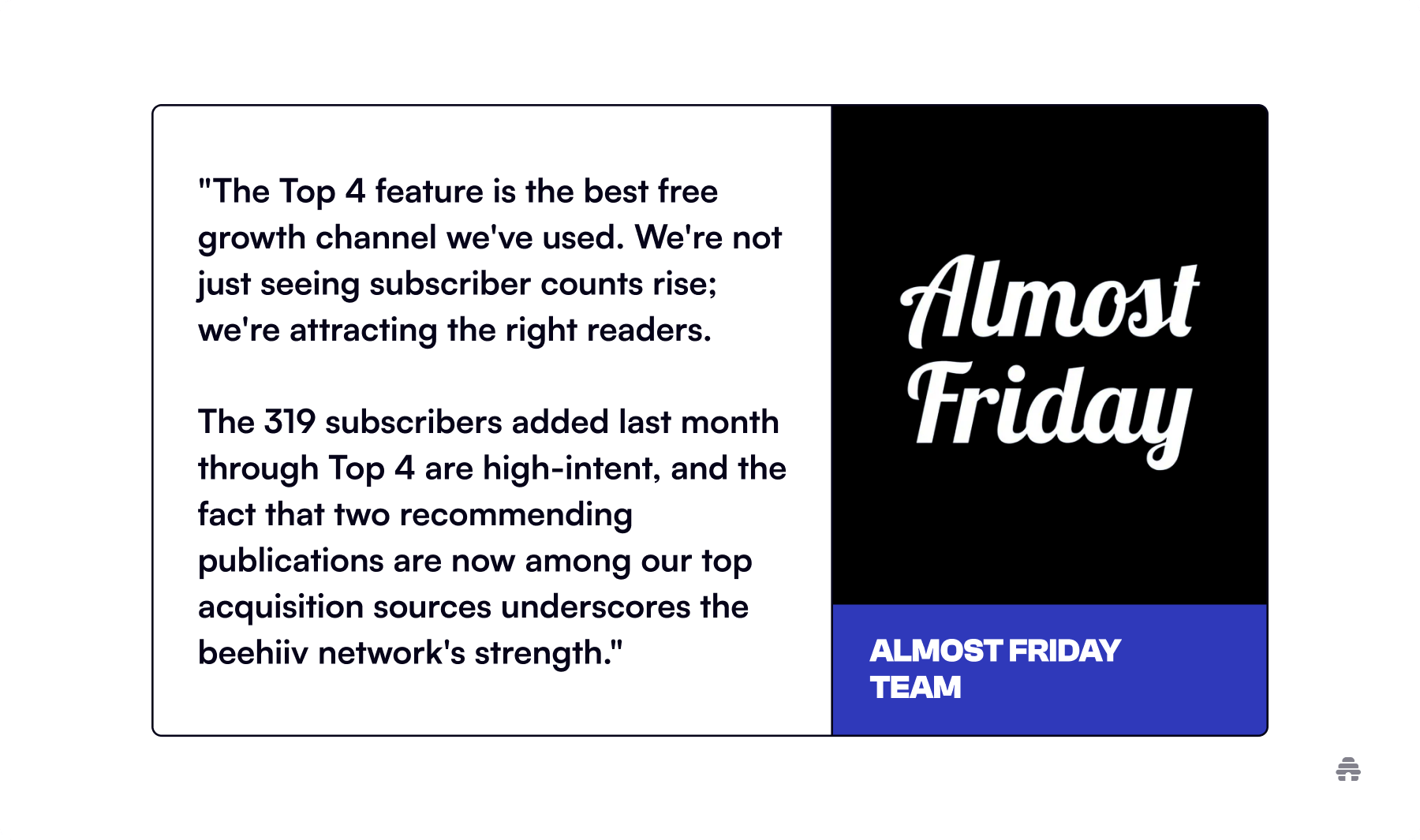 Almost Friday activated Top 4 Recommendations and swiftly observed it evolve into a significant growth driver. In October alone, it delivered 319 new subscribers.