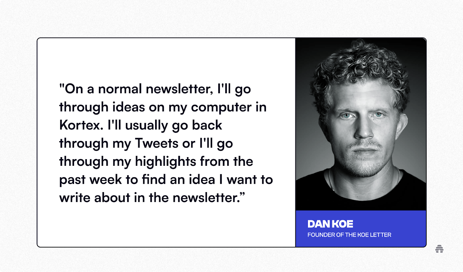 Koe shared, “On a normal newsletter, I'll go through ideas on my computer in Kortex. I'll usually go back through my Tweets, or I'll go through my highlights from the past week to find an idea I want to write about in the newsletter.”