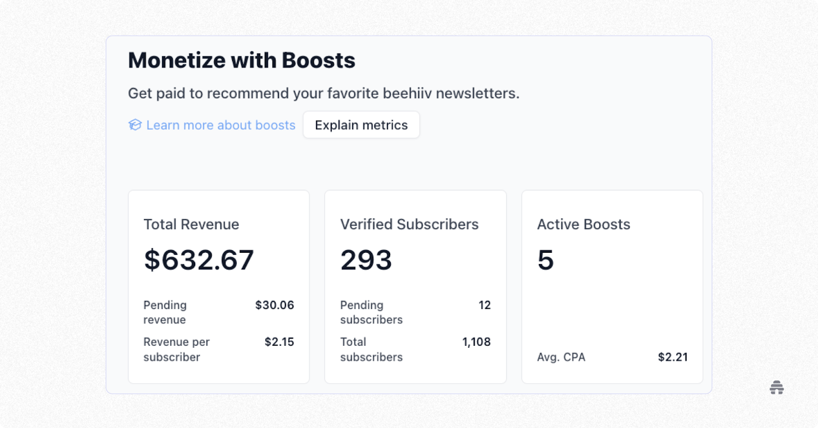 "The ad network... it works on autopilot. One time a lot of people clicked on a B2B ad that paid two dollars per click. So I made $600 from that one email, and that was from the beehiiv ad network."