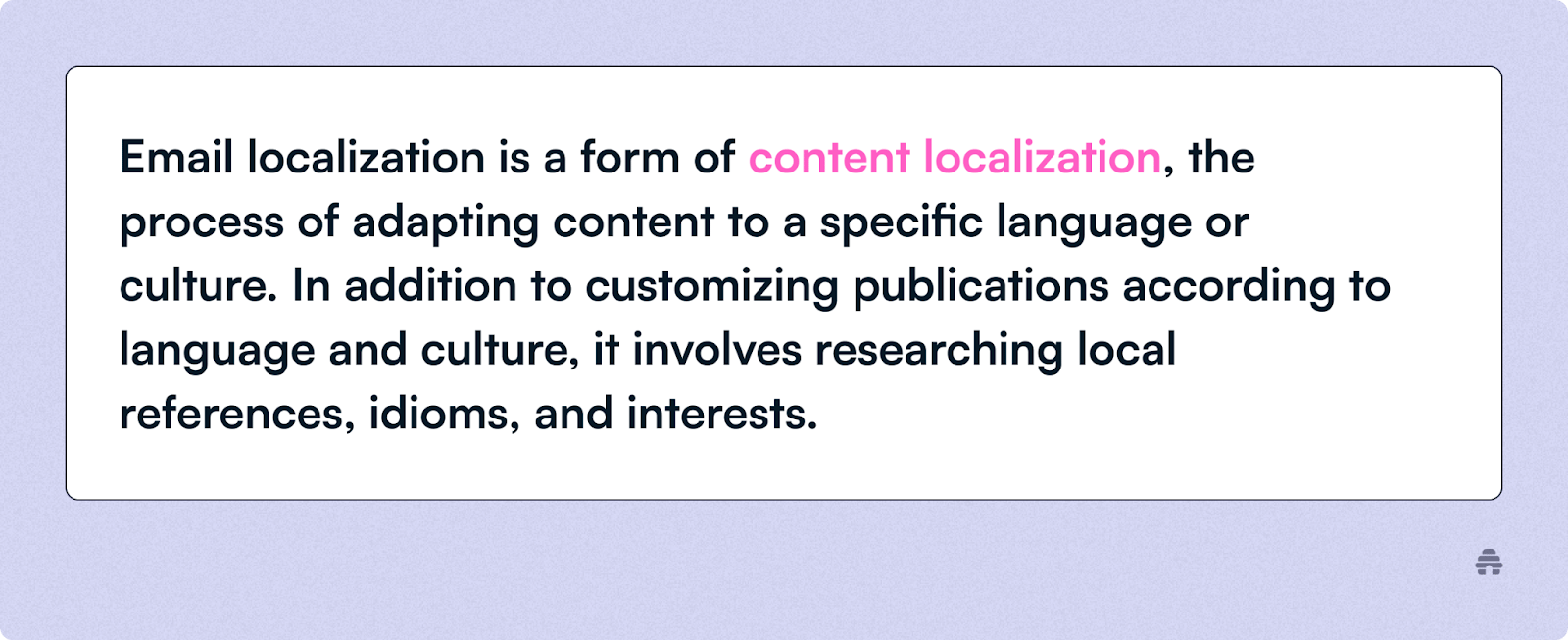 Email localization is a form of content localization, the process of adapting content to a specific language or culture. In addition to customizing publications according to language and culture, it involves researching local references, idioms, and interests.