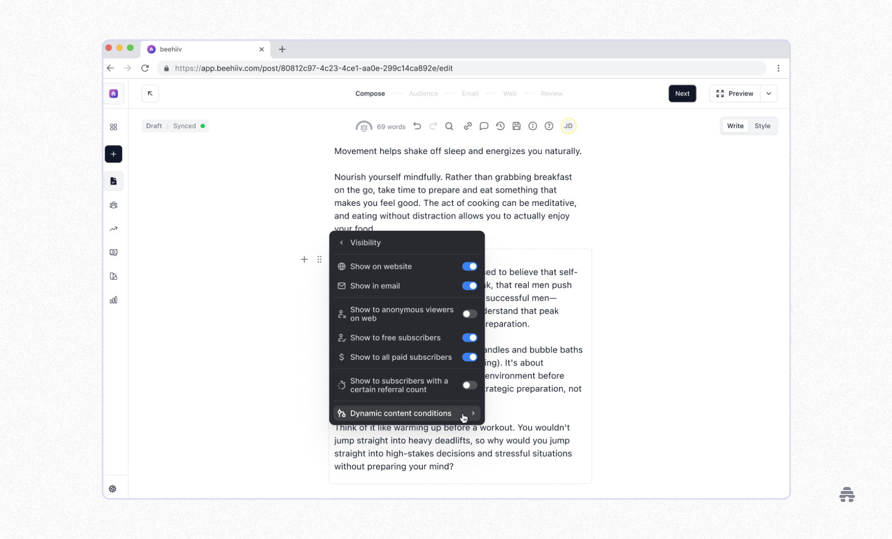 Dynamic Content changes the structure. Inside beehiiv’s editor, creators can: